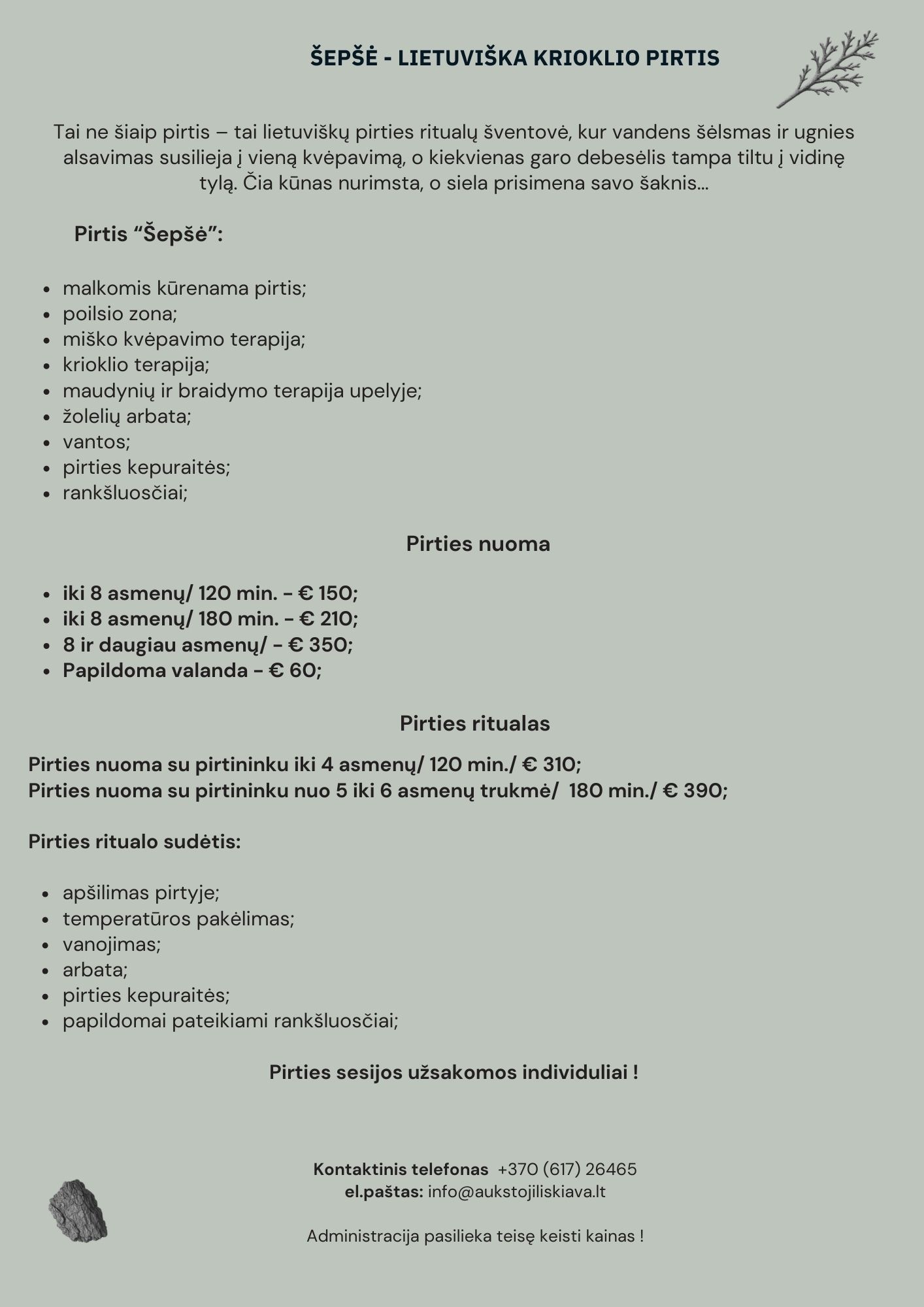 Čia pirtis tampa ritualu, vedančiu per kaitrą į atsipalaidavimą ir lengvumą.Pirties sesijos derinamos ir užsakomos iš anksto.